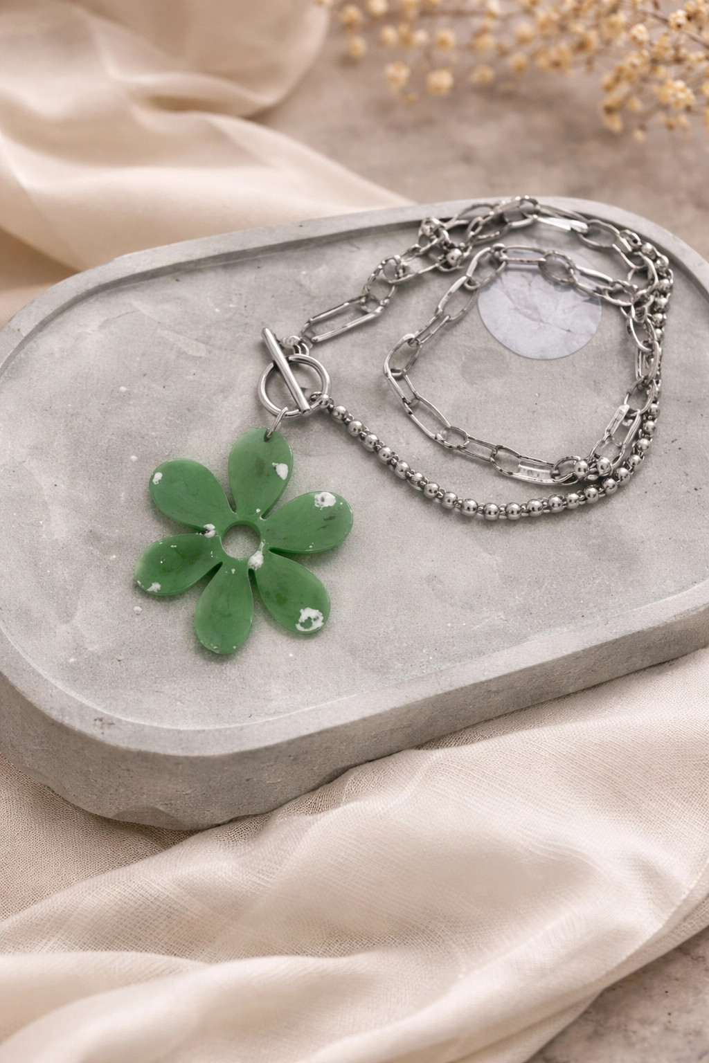 Collier triple mailles en acier composé d'une fleur en jesmonite verte recouverte de feuille d'argent 20,00 € 0,00 €