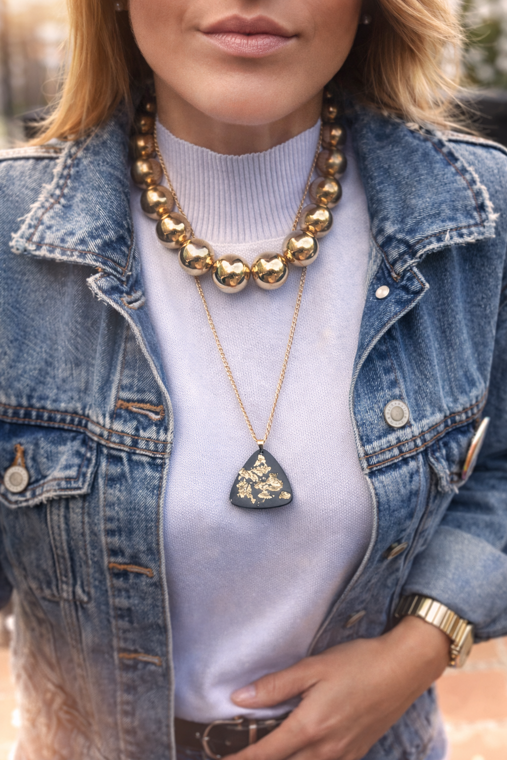 Collier en acier inoxydable doré composé d'un pendentif triangulaire en jesmonite noire et feuille d'or Épuisé 15,00 € 0,00 €