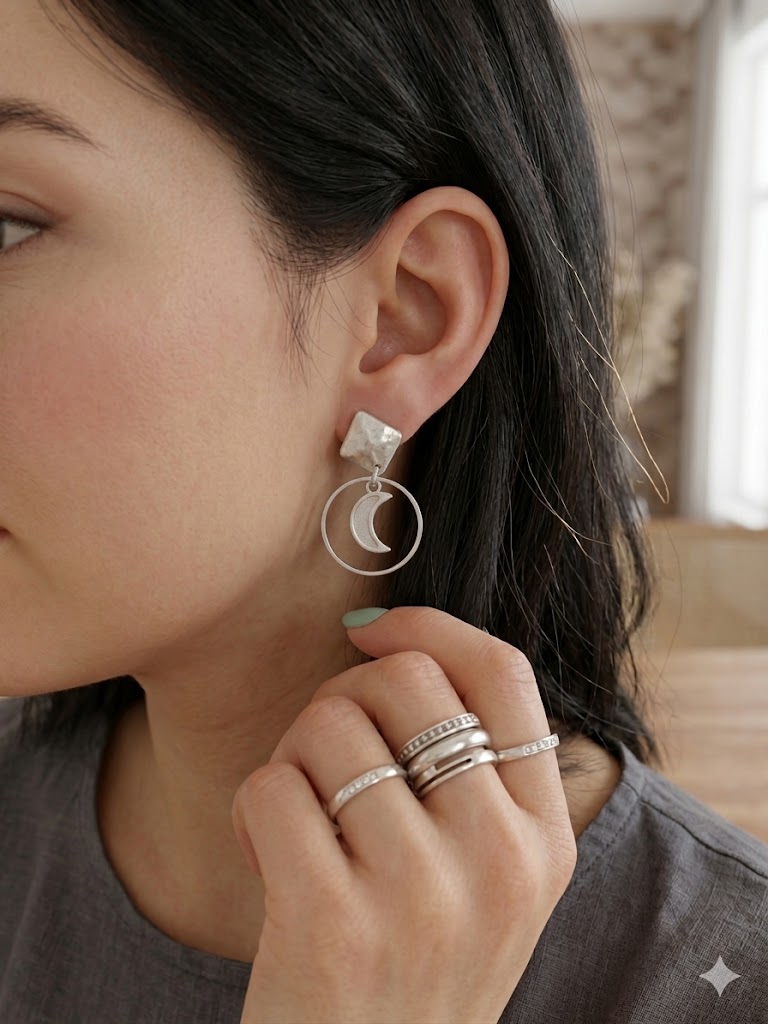 Boucles d’oreilles composées d’une lune en béton et apprêts en acier inoxydable