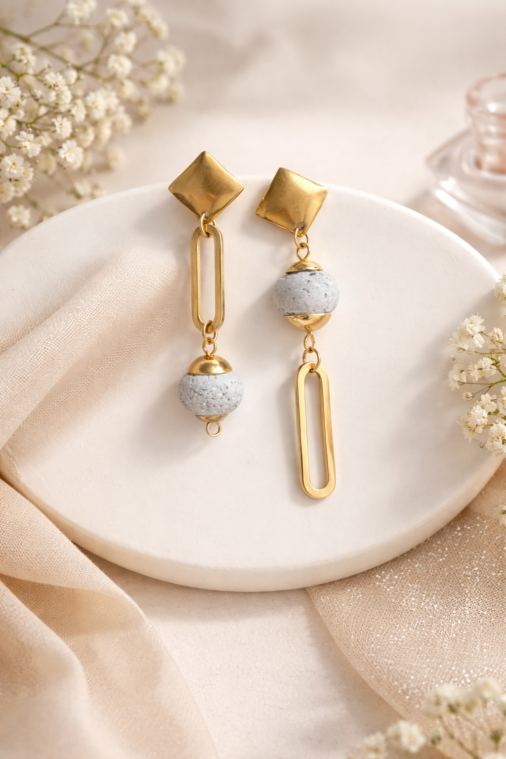 Boucles d'oreilles asymétriques composées d'un apprêt en acier inoxydable doré et d'une perle béton