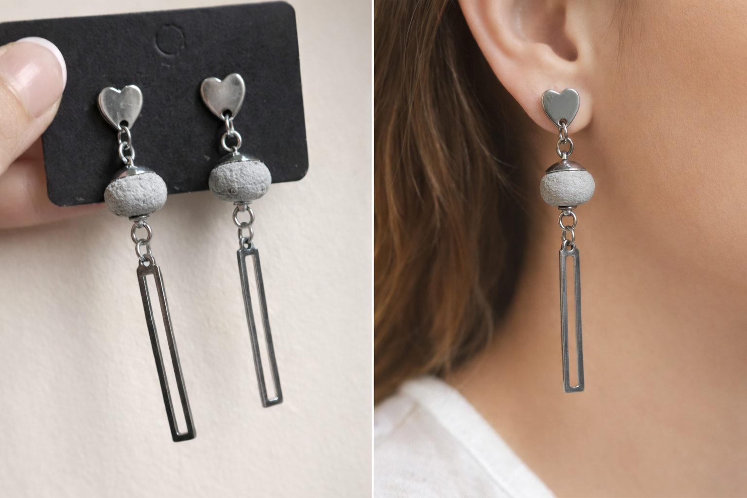 Boucles d'oreilles composées d'apprêts en acier inoxydable et de perle béton (coeur)