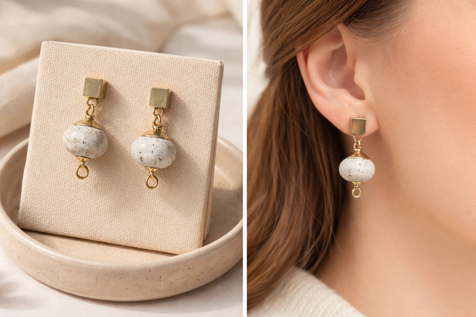 Boucles d'oreilles composées de perles béton et d'acier doré inoxydable