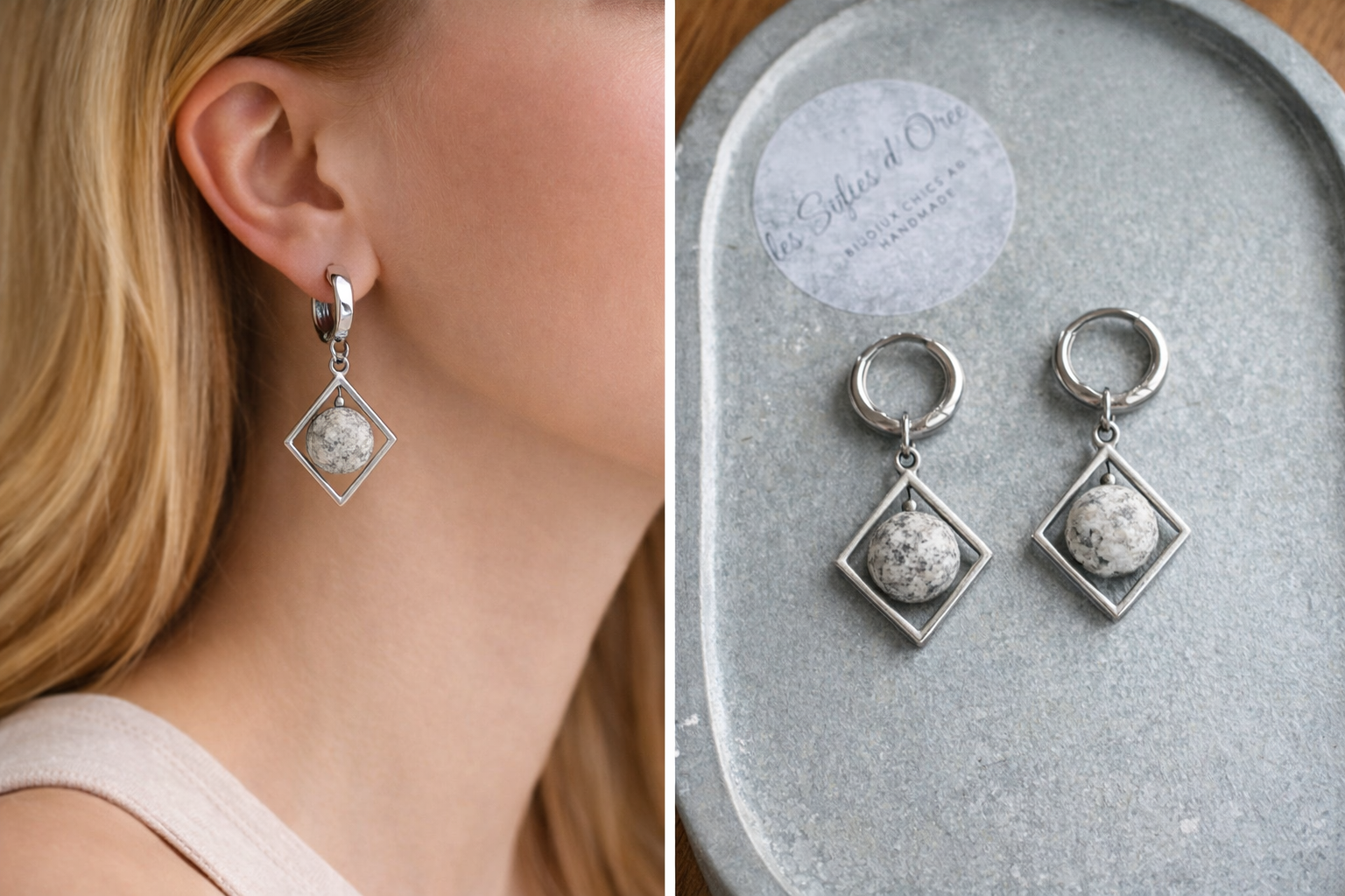 Boucles d'oreilles composées d'un rond béton et d'un losange en acier inoxydable