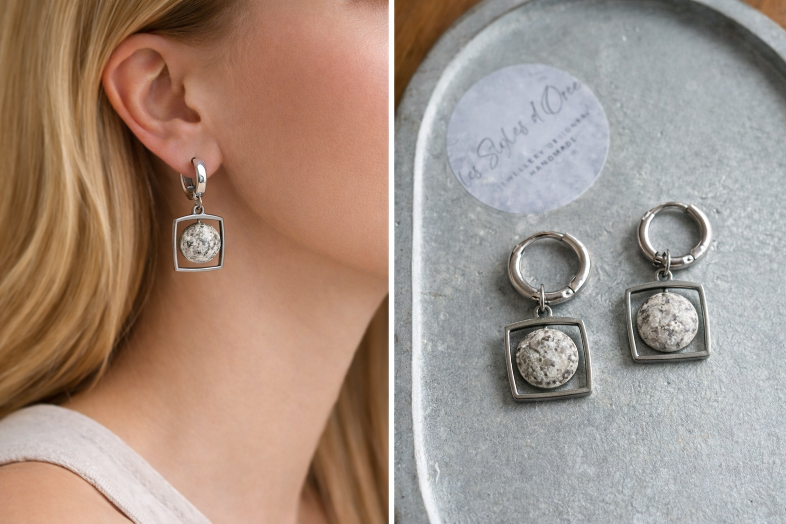 Boucles d'oreilles composées d'une rond béton et d'un carré en acier inoxydable