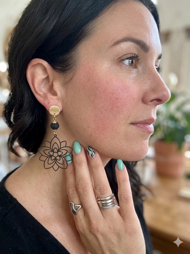 Boucles d'oreilles en acier inoxydable composées de perles noires de lave et de fleurs de lotus en acier inoxydable noir