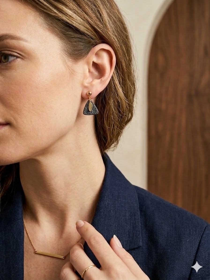 Boucles d'oreilles jesmonite noire et dorée avec apprêt plume en acier inoxydable doré