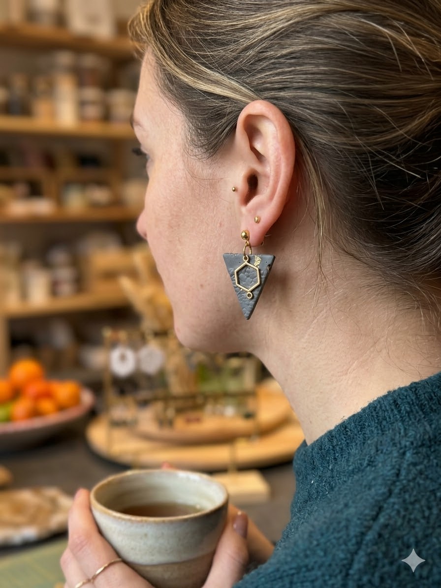 Boucles d'oreilles triangulaires en jesmonite noire et apprêts dorés en acier inoxydable