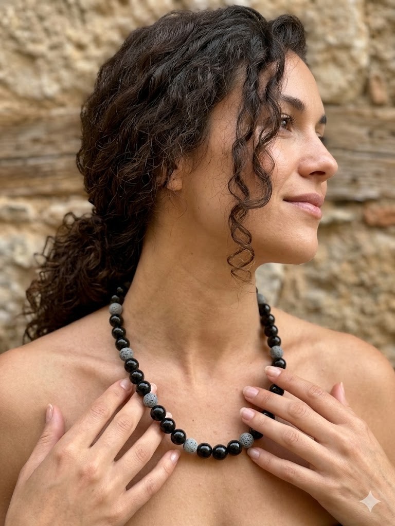 Collier composé de perles béton et perles noires