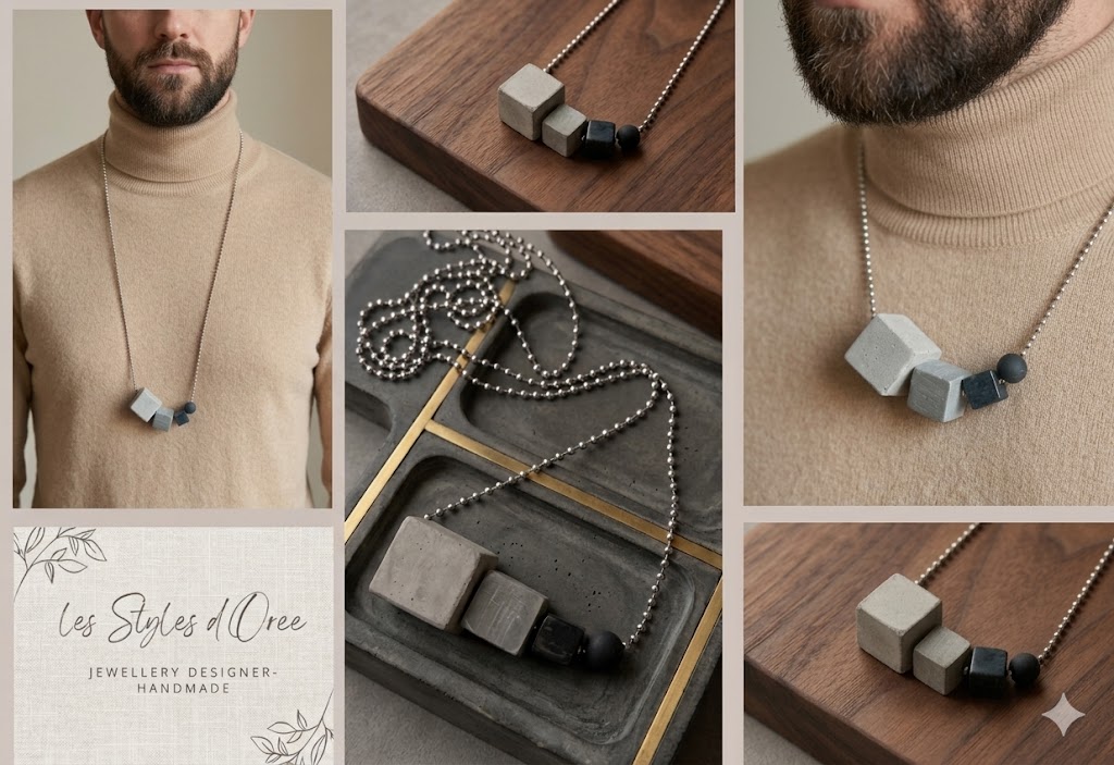 Collier avec pendentif cube en béton et Jesmonite, offrant un design minimaliste et contemporain. Une pièce originale qui mêle matériaux bruts et artisanat pour un style unique.