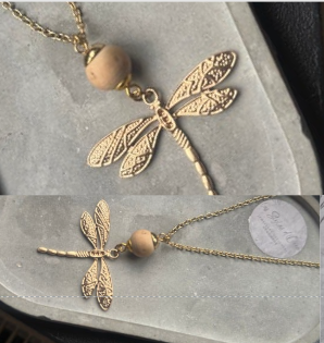 Collier en acier composé d'un pendentif libellule en acier surmonté d'une perle bois