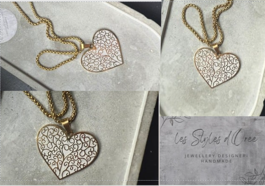 Collier en acier inoxydable doré composé d'un pendentif en forme de coeur composé de ramage en acier