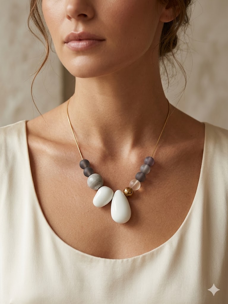 Ajoutez une touche d'élégance subtile avec ce collier orné de perles de résine et de béton. Son design délicat et ses teintes naturelles illuminent le visage avec une élégance discrète, parfaite pour un look raffiné et moderne.