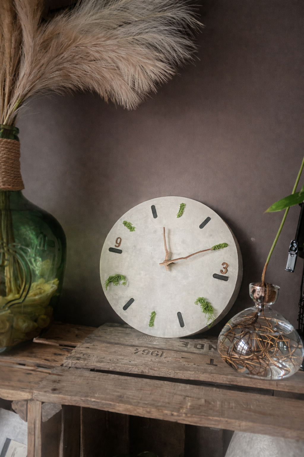 Horloge béton + effet végétal artificiel